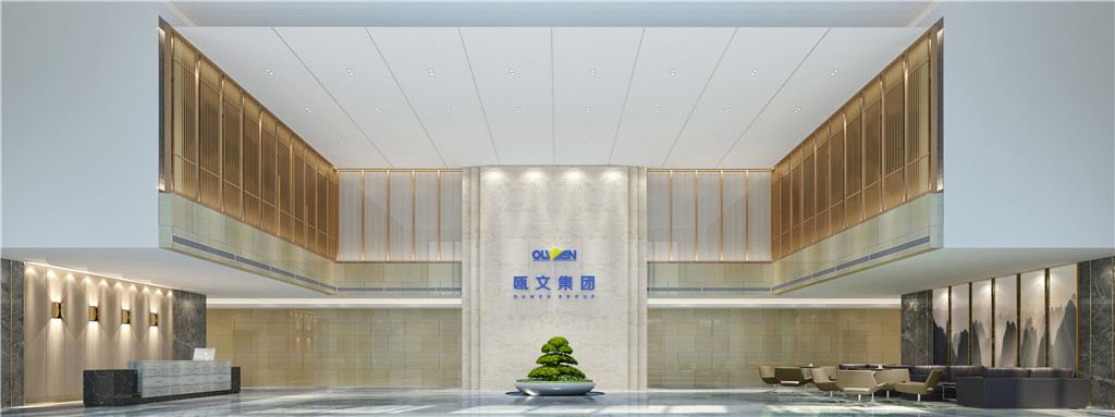 取水之藍、家之皇為元素,以木飾面、陶瓷、大理石為載體,應用于墻面、地面、主背景墻。體現了歐文集團厚德載物,開放包容,儒雅熱情迎八方來客的氣魄。