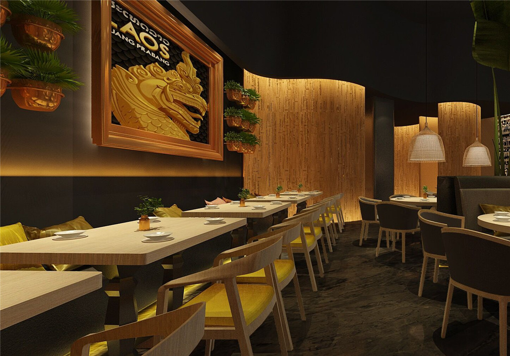 本項目融入大量的泰國元素:手工竹藝編織的收銀臺頂超大燈罩及小吊燈燈罩、木藝雕刻、芭蕉樹、裝飾畫、綠植等,演繹原汁原味的泰國風情。色澤上大多采用原木色調及泥土褐色,散發(fā)著濃烈的自然氣息,搭配明艷的黃色,自然溫馨中不失歡躍之感。自然、熱情、獨特,這是大景傾情打造的地道真實的泰國味道。